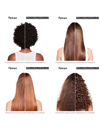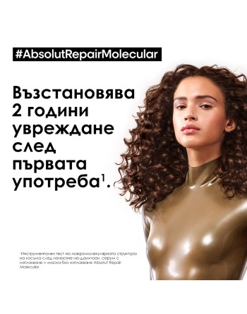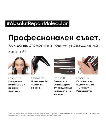 * Инструментален тест след 15 нанасяния на шампоан, серум с изплакване и маска без изплакване Absolut Repair Molecular. **Потребителски тест след 2-седмична употреба на шампоан, серум с изплакване и маска без изплакване Absolut Repair Molecular.*** Инструментален тест след употреба на серум с изплакване Absolut Repair Molecular **** Инструментален тест след нанасяне на Absolut Repair Molecular серум с изплакване.