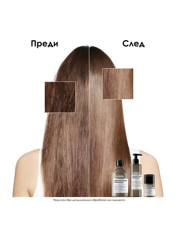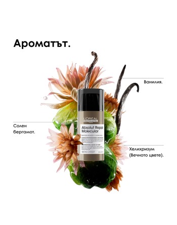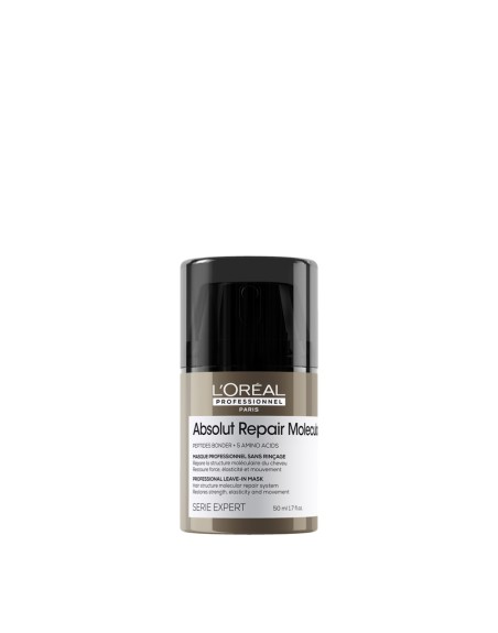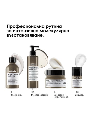 Маска без изплакване за увредена коса в размер за пътуване. Продукт с бързо абсорбираща се кремообразна текстура и система за защита на пептидните връзки, обогатена с аминокиселини. Осигурява термозащита, подсилва косата и придава блясък. Продуктът е формулиран със система за защита на пептидните връзки и 5 аминокиселини за възстановяване на молекулярната структура на повърхността на косъма*. Леката текстура прониква мигновено и възстановява силата на косата. Косата е с подобрена еластичност и се движи свободно**. Придава лекота, блясък и здрав вид за косата, като я предпазва от външни агресии. Absolut Repair Molecular е серия, предназначена за увредена коса, която възстановява 2 години увреждане на косата след първата употреба***. Всеки път, когато косата е увредена, тя губи пептиди, а Absolut Repair Molecular предлага възстановяване на пептидно, молекулярно ниво с научно доказана молекулярна ефикасност. Продуктите са обогатени с 5 различни аминокиселини и система за защита на пептидните връзки, като те работят на молекулярно ниво, за да възстановят молекулярната структура***, здравината, еластичността и движението на косата****.