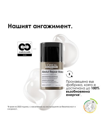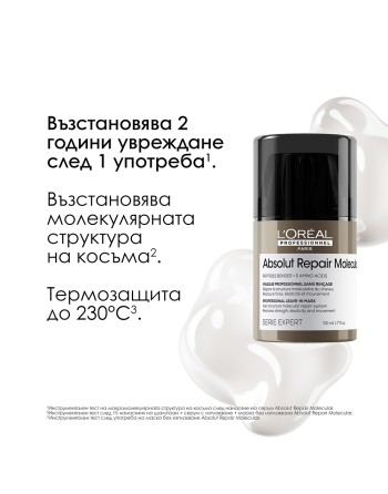 *Инструментален тест след 15 приложения на шампоан, серум с изплакване и маска без изплакване Absolut Repair Molecular. **Потребителски тест след 2 седмици употреба на шампоан, серум с изплакване и маска без изплакване Absolut Repair Molecular. ***Инструментален тест на макромолекулярната структура на косъма след нанасяне шампоан, серум с изплакване и маска без изплакване Absolut Repair Molecular.**** Инструментален тест след 15 нанасяния на шампоан, серум и маска без изплакване Absolut Repair Molecular.