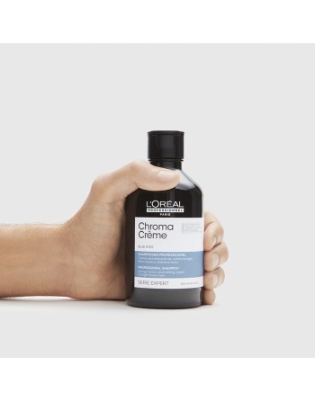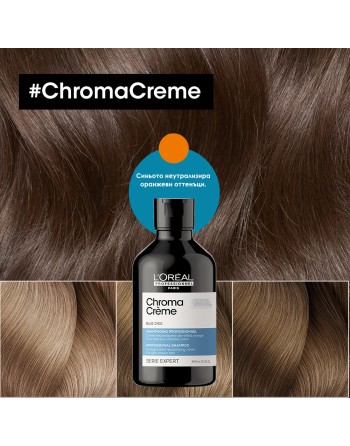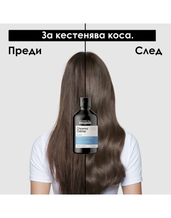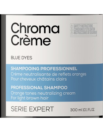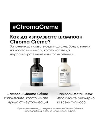 Измийте косата със стандартен шампоан и продължете с коригиращ шампоан Chroma Crème. Нанесете продукта по дължините и оставете да подейства между 5 и 15 минути в зависимост от степента на неутрализация, която искате да постигнете. Препоръчва се шампоанът Chroma Crème да се комбинира с шампоан и маска от серията Metal Detox на L'Oréal Professionnel за оптимално предпазване на цвета на боядисаната коса.