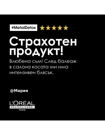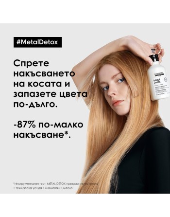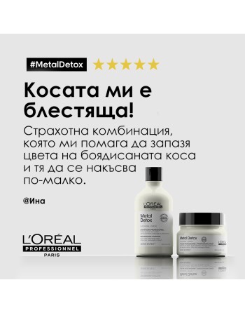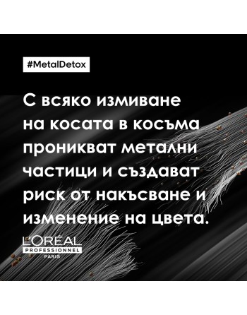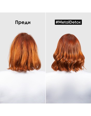 Наличието на метал (мед) във водата е един от факторите, които се отразяват негативно на боядисаната коса. Продуктите от серията Metal Detox осигуряват продължаваща предпазваща грижа за боядисаната коса у дома. Шампоанът и маската предпазват косъма от натрупване на вредни частици и по този начин предпазват цвета на боядисаната коса от избледняване.
