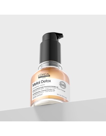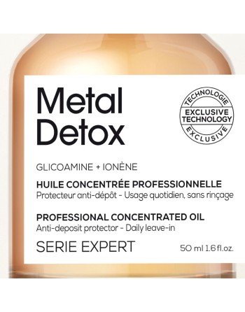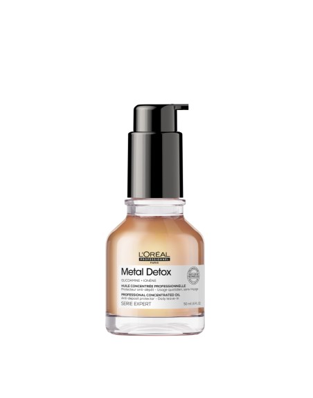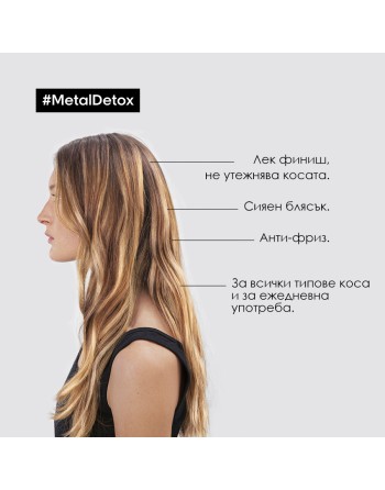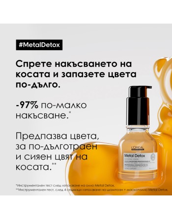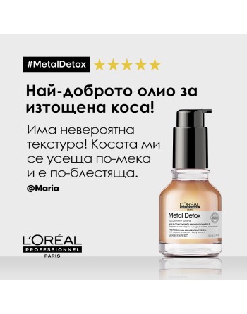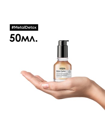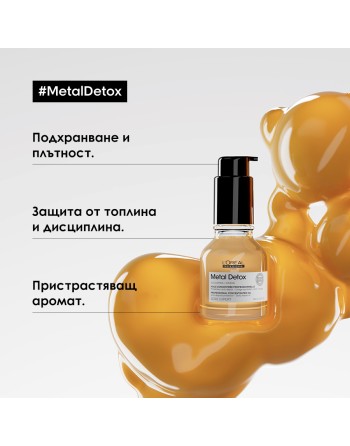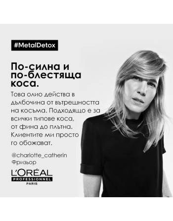 Концентрирано олио, подходящо за изсветлена, боядисана, суха или изтощена коса. Осигурява до 97% по-малко накъсване на косата* и предпазва цвета на боядисаната коса**, за по-дълготраен и сияен цвят. Предпазва от топлина до 230°* и защитава от влагата. Осигурява на косата два пъти повече подхранване*, моментална плътност и дисциплина. Не утежнява и има пристастяващ аромат, който включва нотки на лимонена трева, мандарини, бергамот цитрус и лимон. *Инструментален тест след използване на олио Metal Detox.**Инструментален тест, след 4 седмици използване на шампоан + маска+ олио Metal Detox.***Инструментален тест след нанасяне на шампоан + маска + олио Metal Detox.