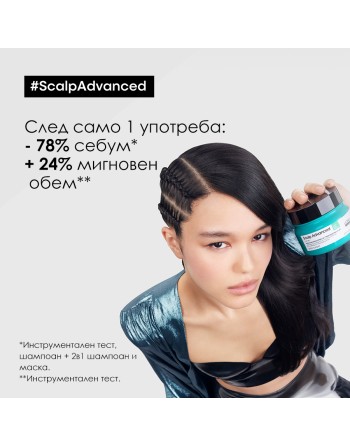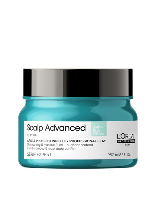 Грижа 2 в 1, която обединява действието на шампоан и маска, обогатена с 6% глина. Помага за интензивното почистване на повърхността на скалпа от натрупаните замърсявания. Премахва 78% от натрупания себум още след първата употреба*. Може да се използва като шампоан и маска, като се нанася на кожата на главата или по дължините. *Инструментален тест, шампоан + 2 в 1 шампоан и маска с глина.